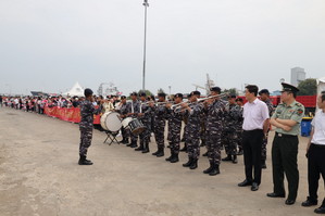 Setibanya di dermaga, para tamu dari China disambut hangat dengan tarian Sekar Jagad, yang merupakan salah satu tarian khas dari Bali. Acara berlanjut dengan pengalungan syal batik khas Betawi kepada Commander of PLAN Task Formation 989, Senior Captain Zhang Huiwu.